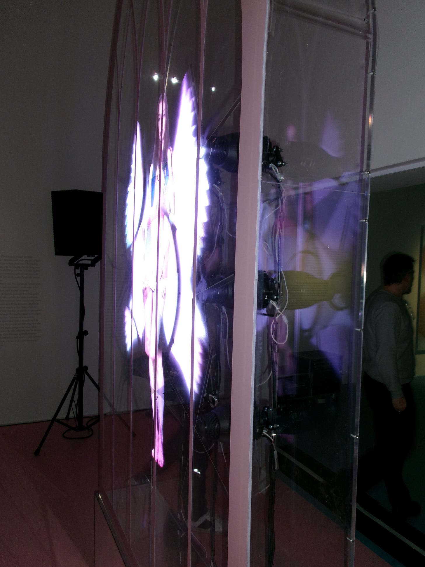 I went by train from Vienna to Linz, to see my friend Arvida’s show — to see her in-the-flesh and as a wingèd amalgamation of herself and other bodies. Divine light danced across LED fans trapped in a cathedral window, like coolers inside a gigantic clear PC. Poetry emanated from a seashell. Siren eyes gazed out from a pile of sand. There is a subculture where users worship the cables and wires themselves, where they glimpse the divine in the flicker of cracked liquid crystal displays, where they communicate with Spirit through an ordinary keyboard. And what is Spirit, if not a pulverised version of what also moves in you? My voice was there, mingled with the other girls. I was dissolved into the swarm that I have always dreamed of, in love with its potential: all of us becoming one, all of us remaining different, all of us uttering the poetry that came to us first, before someone else asked us to start making sense. The floating words that were ours and not-ours, skimmed from the corpora of fleeting feeling that shimmers across time. Feelings that were consistently communicated – but still confusing, intense. “But what’s real anyway?” asked Arvida, or Arvida’s clone, through the speakers. “Sometimes the lines blur a bit…” Tension via notes from others, anonymised users who were nervously seduced by Arvida’s self-trained but AI-generated texts and nudes. My own little clone was trained on a thirteen-minute voice note. She reads a bit of the essay I had written for Arvida’s last show: “The ghost in the machine disturbs self-identified real women, whoever they are, and the people who supposedly love them…”